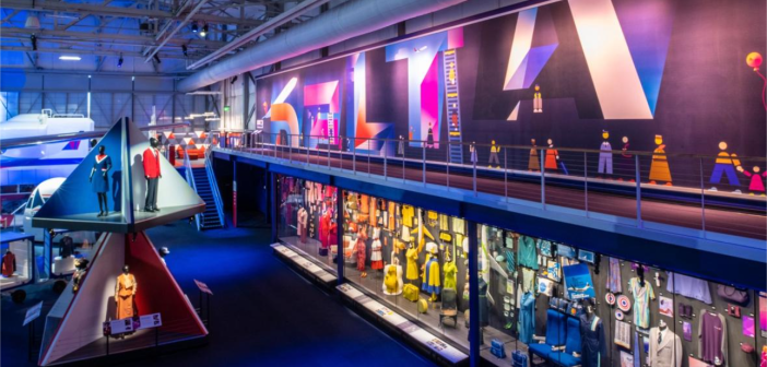 The Delta Flight Museum, which reopens to the public on Monday, April 7th, features the original 13 ft. high, 99 ft. long digital mural “Keep Climbing” to celebrate Delta’s 100th anniversary. The artwork, created with Adobe Illustrator, includes an interactive element where visitors can align the letter on their ticket with the mural to take a photo.