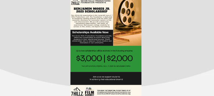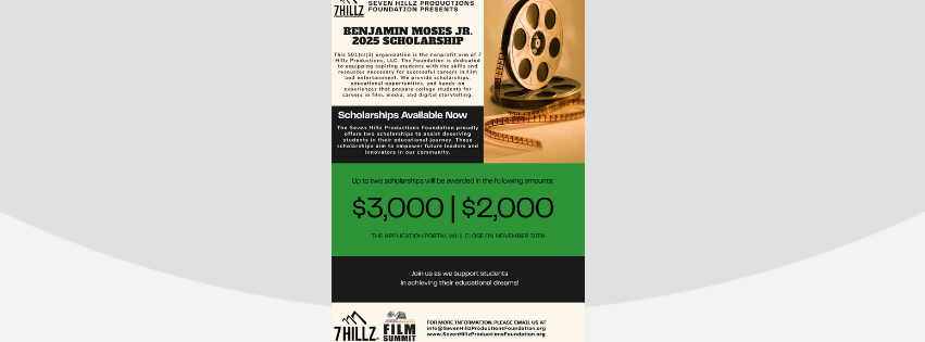 The Seven Hillz Productions Foundation®️ is pleased to announce the 2025 Benjamin Moses, Jr. Scholarship, created to support creative individuals pursuing careers in film and media. Our mission is to “Inspire Aspiring Filmmakers” and encourage them to build opportunities within the industry.